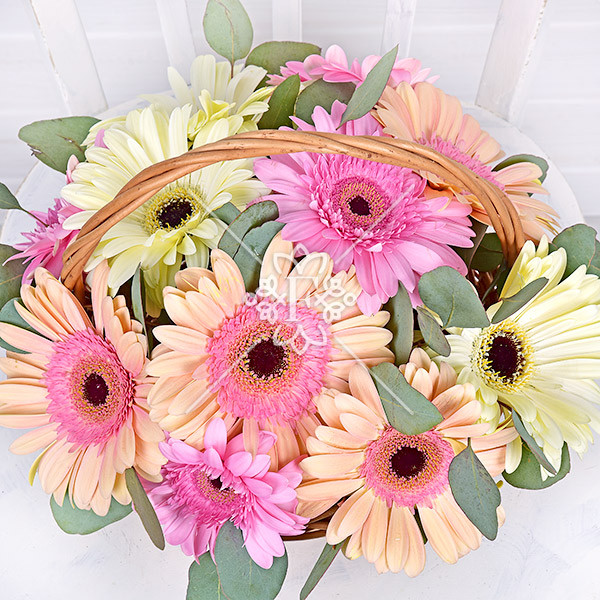 Невероятные герберы  розового, кремового и персикового оттенка в сочетании с зеленью эвкалипта выглядят совершенно. От композиции в цветочной корзинке невозможно отвести восторженный взгляд!