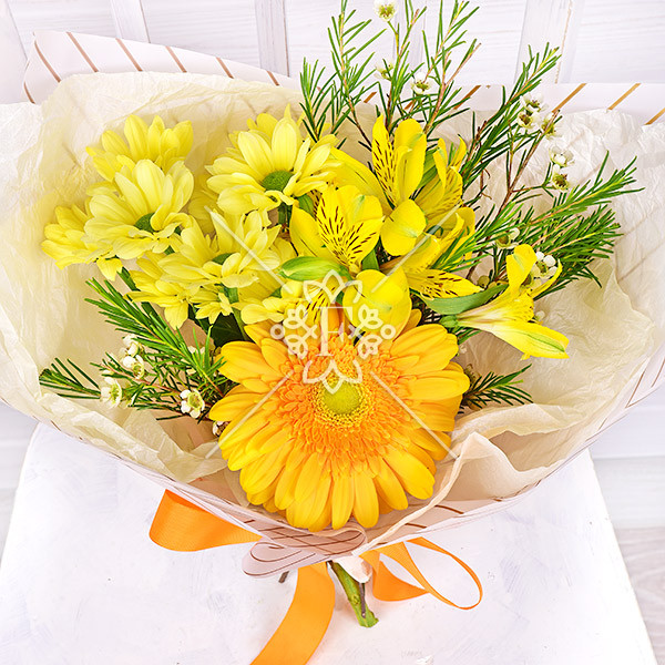 Гербера желтая – 1 шт., альстромерия желтая – 1 шт., хризантема желтая  - 1 шт.,хамелациум – 1 шт., упаковка, лента.