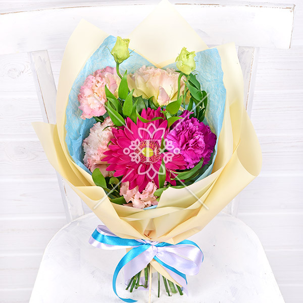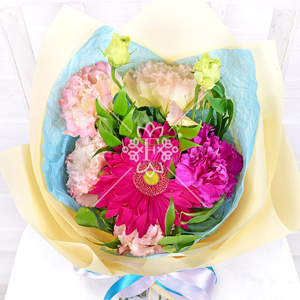 Гербера малиновая – 1 шт., эустома розовая – 1 шт., гвоздика фиолетовая – 1 шт., зелень декоративная, упаковка, лента.