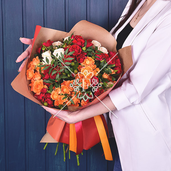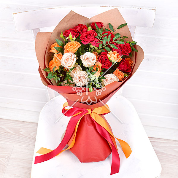 Букет «Закат в Палермо» из оранжевых, красных и кремовых кустовых роз с первого взгляда покорит Ваше сердце!  Ощущение уютного вечера и приятных комплиментов  под теплыми  закатными лучами гостеприимной Италии подарит эта цветочная композиция.
