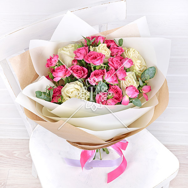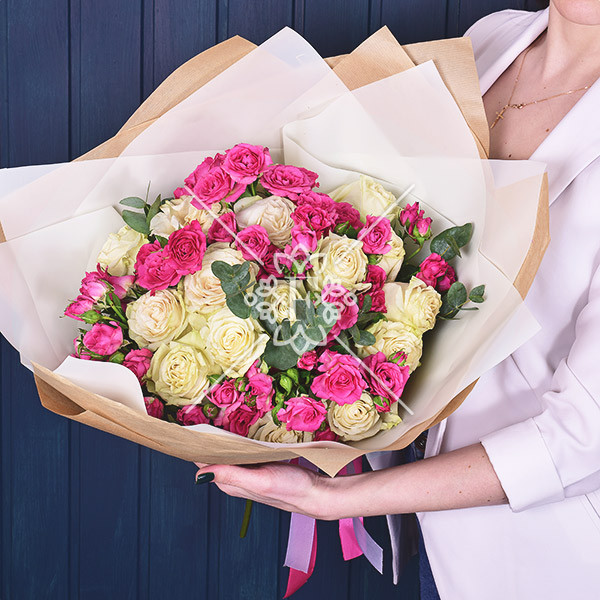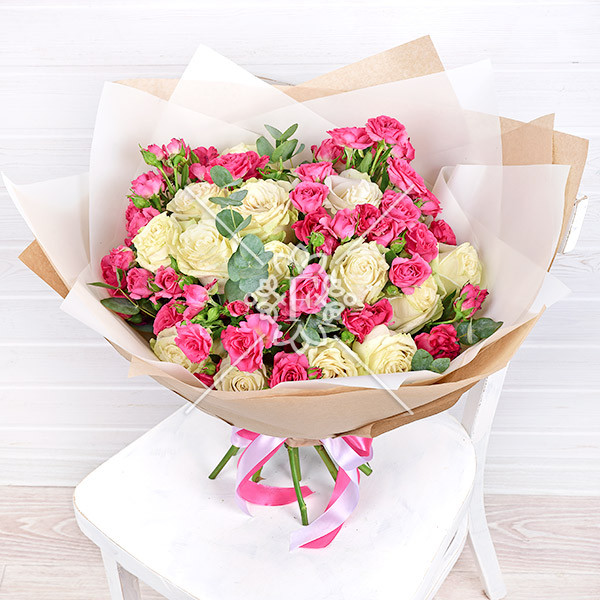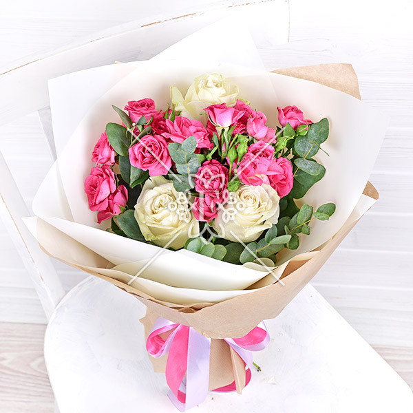 В этой композиции прекрасно сочетаются белоснежно-ванильные одноголовые розы –символ искренности и уважения, а так же кустовые розы насыщенно-розового оттенка, которые без слов расскажут получателю о Ваших нежных чувствах, выразят восхищение и восторг!